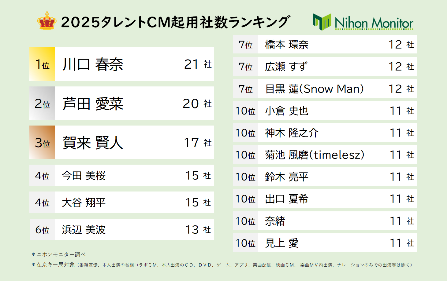 Published 2025-12-01 at 1461 × 920 in 単独首位の川口春奈さんが年間王者3連覇を達成!~ニホンモニター2025タレントCM起用社数ランキング発表~